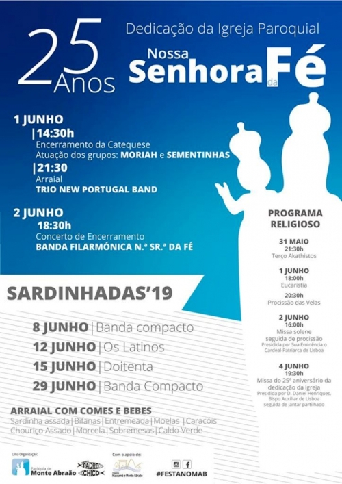 A Paróquia de Monte Abraão vai celebrar os 25 anos da dedicação da igreja paroquial. O ponto alto será no dia 2 de junho, Domingo, com Missa solene, às 16h00, presidida pelo Cardeal-Patriarca de Lisboa, D. Manuel Clemente, seguida de procissão. O programa religioso das festividades tem início a 31 de maio, às 21h30, com a oração do Terço ‘Akathistos’. A 1 de junho, às 18h00, haverá Eucaristia e, às 20h30, procissão de velas. Os festejos dos 25 anos da igreja de Monte Abraão terminam a 4 de junho, terça-feira, às 19h30, com a Missa presidida por D. Daniel Henrique, Bispo Auxiliar de Lisboa, seguida de jantar partilhado.