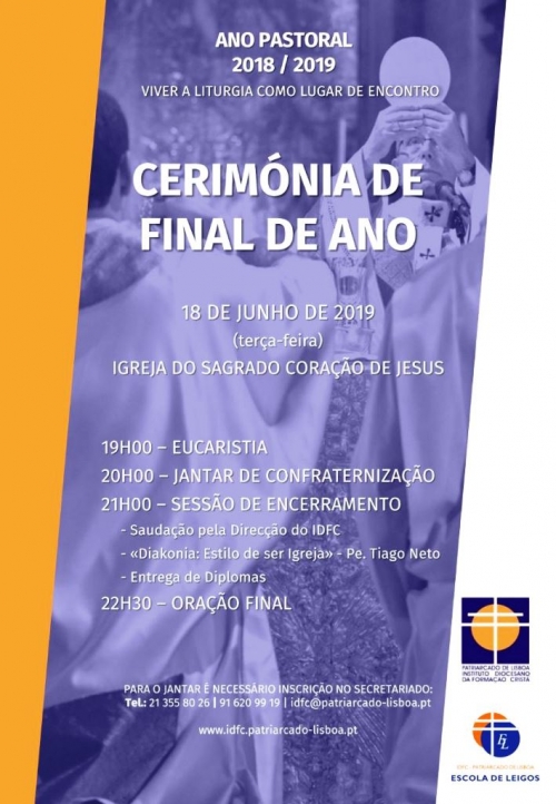As 19h00, vai ser celebrada a Eucaristia, a que se segue jantar de confraternização. No final da refeição, o padre Tiago Neto profere uma palestra intitulada ‘Diakonia: estilo de ser Igreja’, “em antecipação e preparação do programa do próximo ano pastoral”, informa esta instância formativa do Instituto Diocesano da Formação Cristã (IDFC). “A Escola de Leigos convida todos os seus alunos e antigos alunos, professores, colaboradores e amigos, a participar nesta cerimónia”, salienta um comunicado, frisando que após a palestra haverá “a distribuição dos diplomas aos finalistas do centro de Oeiras do curso Bíblia e Teologia (também denominado Triénio Bíblico-Teológico)”.
