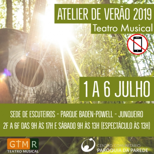 O GTMR – Grupo de Teatro Musical Religioso está a preparar um Atelier de Verão, que vai decorrer de 1 a 6 de julho, na sede dos escuteiros da Parede, no Pinhal do Junqueiro. Esta iniciativa, para maiores de 8 anos, vai ter lugar de segunda a sexta-feira, das 9h00 às 17h00. No sábado, dia 6, a formação decorre das 9h00 às 13h00, terminando com um espetáculo. “Terá atividades de teatro musical e dança com uma apresentação final para os pais”, informa a organização. O Atelier de Verão tem um custo de 85 euros (desconto de 25% para membros GTMR ou para irmãos) e inclui a oferta de uma t-shirt. As crianças devem ainda levar almoço e lanche.