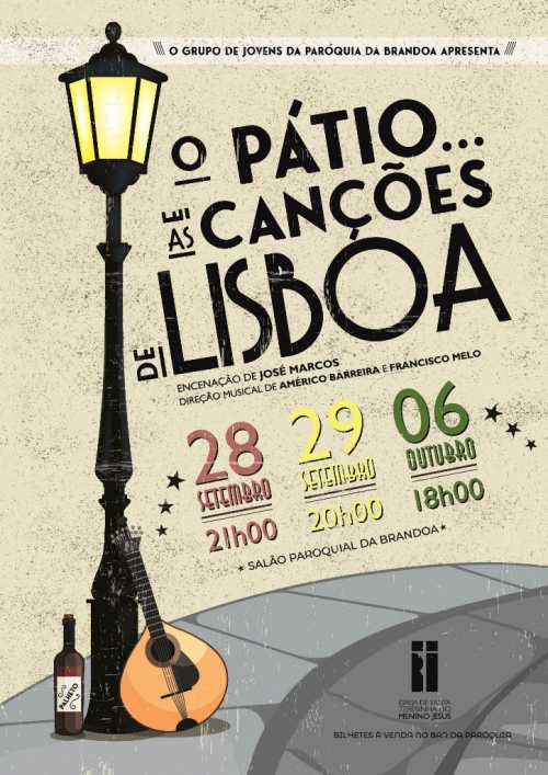 Integrado nas festas de Santa Teresinha do Menino Jesus, os jovens do Grupo de Teatro da Paróquia da Brandoa vão apresentar a peça de teatro ‘O Pátio e as Canções de Lisboa’. A atuação vai subir ao palco do salão paroquial em três sessões: 28 de setembro, sábado, às 21h00, 29 de setembro, Domingo, às 20h00, e finalmente a 6 de outubro, pelas 18h00.