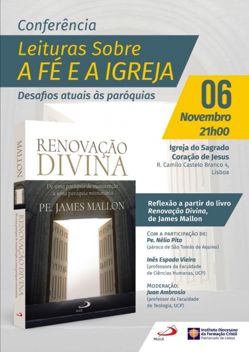 ‘Leituras sobre a fé e a Igreja - Desafios atuais às paróquias’ é o tema da conferência que o Instituto Diocesano da Formação Cristã (IDFC), do Patriarcado de Lisboa, organiza no dia 6 de novembro, quarta-feira, pelas 21h00 na Igreja do Sagrado Coração de Jesus. Esta iniciativa, que é organizada em parceria com a Paulus Editora, vai incidir a reflexão a partir do livro ‘Renovação Divina’, de James Mallon, e tem como convidados o padre Nélio Pita, pároco de São Tomás de Aquino, e Inês Espada Vieira, com moderação de Juan Ambrosio, professor da Universidade Católica.