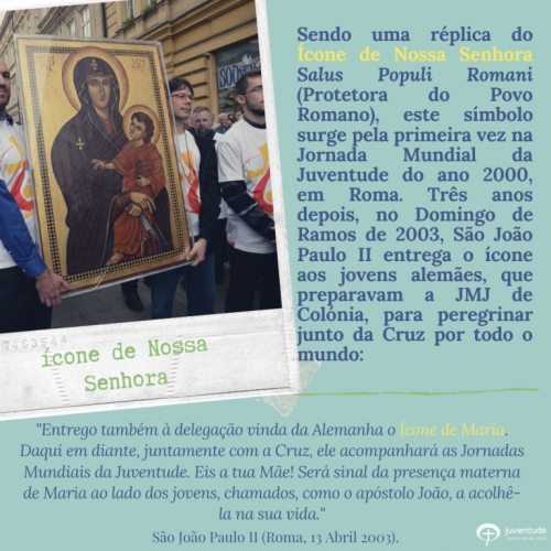Apesar de esta Cruz ter começado como único símbolo da JMJ, esta viria a fazer dupla, a partir de 2003, com o Ícone de Nossa Senhora Salus Populi Romani (Protectora do Povo Romano). Este ícone é uma réplica do Salus Popoli Romani original que, segundo a tradição, tem a sua origem no século VI d.C., tendo sido pintado por S. Lucas e chegado a Roma no ano de 590 pelas mãos de Santa Helena, mãe do Imperador Constantino.