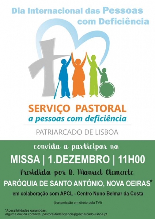 Por ocasião do Dia Internacional das Pessoas com Deficiência (3 de dezembro), o Cardeal-Patriarca de Lisboa, D. Manuel Clemente, vai presidir à Eucaristia na Paróquia de Santo António de Nova Oeiras, na Vigararia de Oeiras, no próximo Domingo, 1 de dezembro, da parte da manhã (11h00). A celebração, que vai ter transmissão em direto pela TVI, é organizada pelo Serviço Pastoral a Pessoas com Deficiência do Patriarcado de Lisboa, em colaboração com a APCL (Associação de Paralisia Cerebral de Lisboa) - Centro Nuno Belmar da Costa.