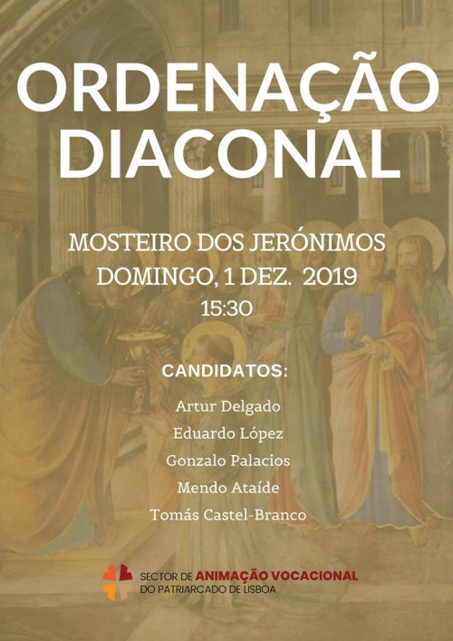 No próximo dia 1 de dezembro, Domingo, às 15h30, o Cardeal-Patriarca de Lisboa, D. Manuel Clemente, vai presidir à Ordenação Diaconal de cinco candidatos da diocese, alunos do Seminário dos Olivais e do Seminário ‘Redemptoris Mater’, em Caneças: Artur Delgado, Eduardo López, Gonzalo Palacios, Mendo Ataíde e Tomás Castel-Branco.