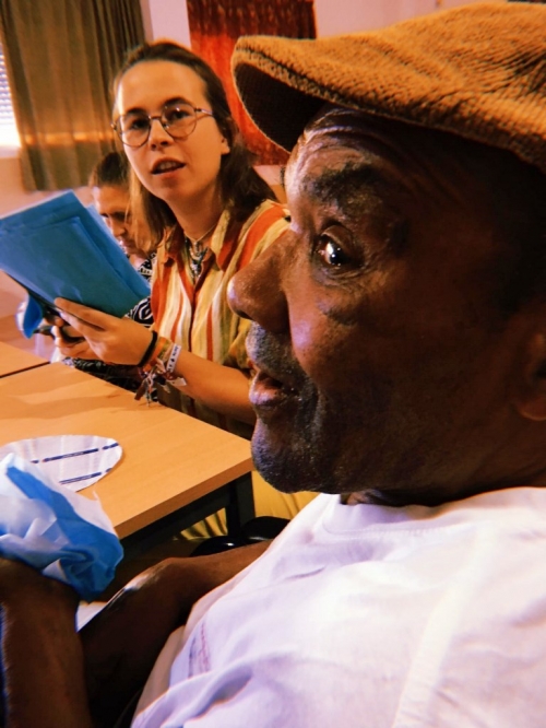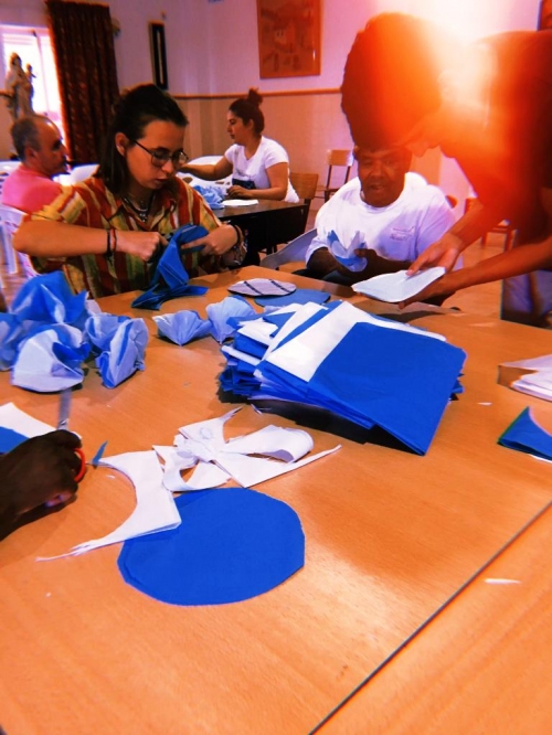 No verão de 2018, esteve em Atenas (Grécia) a ajudar o Projeto ELEA num campo de refugiados em Eleonas, “que proporciona um pouco mais de qualidade de vida a estas pessoas que perderam tudo e que agora pouco têm”. Este ano esteve em Onuva. Partiu por um mês com a sua irmã Carminho, com o António e com o Miguel para Sevilha, “para ajudar uma comunidade espanhola que acolhe pessoas com problemas”. Diz que foi “sem grandes espectativas, mas também sem grandes medos, pois ia com uma certeza: É Deus que quer que eu vá! Foi Ele que me pediu para ir para o meio do calor, para largar tudo e simplesmente IR.” Conta que “Onuva, ou comunidade da Mãe de Deus, é constituída por casais consagrados, sacerdotes, freiras, leigos consagrados e voluntários que vão aparecendo durante o ano. A sua missão é ajudar todos os que por diversas razões foram discriminados pela sociedade, em especial os sem-abrigo; pessoas com algum problema psiquiátrico ou psicológico e ainda pessoas que tenham problemas físicos. Conhecidas como os residentes, estão lá voluntariamente, mas porque também não tem outro sítio para onde ir. Não têm mais ninguém, vivem sozinhos, ou porque a sua família não tem possibilidades para as sustentar. São cerca de 30 residentes sendo que com as irmãs, padres e consagrados éramos aproximadamente 45 pessoas.” O dia-a-dia era dividido entre a missa e adoração ao Santíssimo, preparar e servir os pequenos-almoços aos residentes (“a única refeição personalizada que tinham e era a que me permitia ter um contacto mais próximo com todos os que precisavam”), o serviço na lavandaria onde estendiam, recolhiam e dobravam a roupa, oração da manhã (guiada pelo caderno de orações do MSV), servir o almoço aos residentes, almoço em grupo (“esta refeição era o momento em que conseguia falar mais com as irmãs. Era aqui que trocávamos histórias e riamo-nos de coisas caricatos da nossa vida”), duas horas de descanso para recarregar baterias em alguns dias (“fiquei vários dias com os residentes. Umas vezes ficava simplesmente a ouvir o que tinham para contar, outras falava só eu e noutras ainda tocava viola”), oração da tarde e regresso à lavandaria (“era preciso tirar a roupa que tinha estendido de manhã e dobrá-la”). “Como disse ao descrever o nosso dia em Onuva, o trabalho era muito backstage, era fazer no silêncio, fazer tarefas sem nos verem, não era contacto direto com os residentes, com aqueles que eu tanto achava que ia estar. Com o decorrer dos dias, com o exemplo das irmãs fui percebendo a importância destas tarefas. Sem um cameraman não há filme, sem uma encenadora não há teatro, sem uma empregada doméstica não há limpeza numa casa, e ambas são profissões, muitas vezes, realizadas sem a devida valorização. Eu era assim, eu não compreendia como é que ao lavar a loiça e a estender a roupa estava a ajudar o próximo. O que também me ajudou a não desistir quando achava que o meu trabalho era insignificante foi o facto de saber que Nossa Senhora estava sempre a olhar para mim. Eu sei que está sempre ao meu lado, mas ainda mais em Onuva, pois este projeto é d’Ela. Assim, sempre que perdia as forças parava e rezava uma Ave-maria, bastava uma e voltava, voltava a trabalhar e a sorrir. Foi um mês repleto de histórias, de aprendizagem, de oração e de trabalho, foi um mês único. Quando cheguei a Lisboa e perguntavam-me o que fiz, como foi, se gostei, etc, a primeira coisa que dizia era: ‘Vivi como freira durante um mês e gostei muito!’ A primeira reação de quem ouvia isto era rir, mas depois claro que exigiam uma explicação. E assim começavam a contar os meus dias na maravilhosa comunidade da Mãe de Deus, Onuva”, partilha.