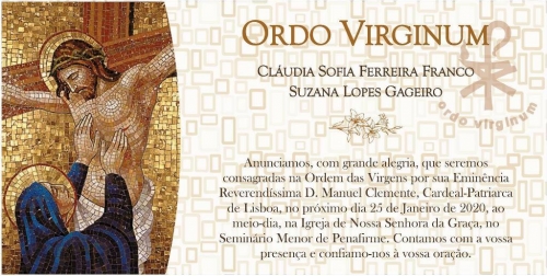 Cláudia Franco e Suzana Gageiro vão ser consagradas na Ordem das Virgens, pelo Cardeal-Patriarca de Lisboa, D. Manuel Clemente, numa celebração que vai ter lugar na Igreja de Nossa Senhora da Graça, no Seminário Menor de Penafirme, no próximo dia 25 de janeiro, sábado, às 12h00.