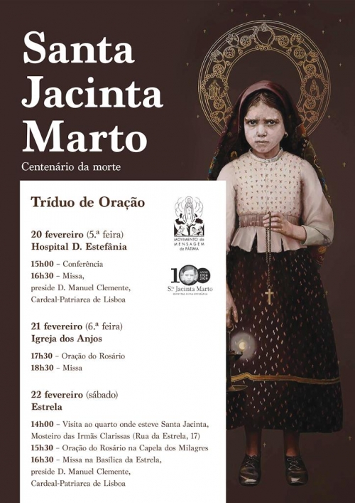 O Secretariado Diocesano de Lisboa do Movimento da Mensagem de Fátima está a organizar um ‘Tríduo de Oração’, entre 20 e 22 de fevereiro, para assinalar o centenário da morte de Santa Jacinta Marto.