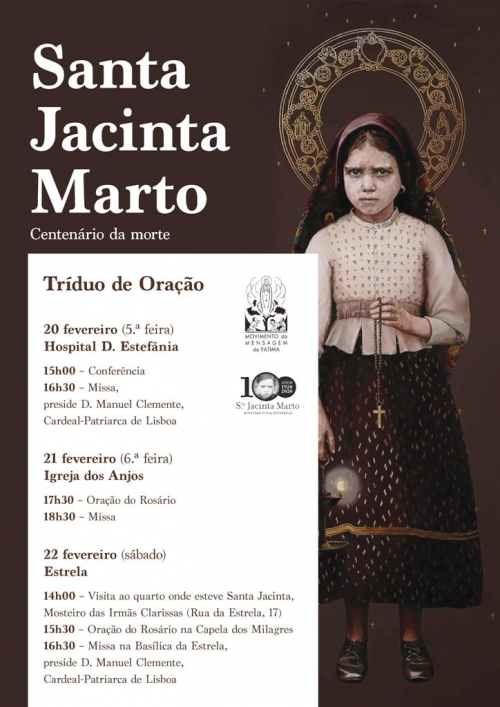 Jacinta morreu só, no Hospital D. Estefânia, em Lisboa, após muito sofrimento. Celebramos o Centenário da passagem de Santa Jacinta Marto para o Céu, para ao pé daquela Senhora tão bonita que a levou a ser, voluntariamente, uma alma reparadora até ao fim, para converter e salvar do inferno mais pecadores. Uma generosidade sem medida.