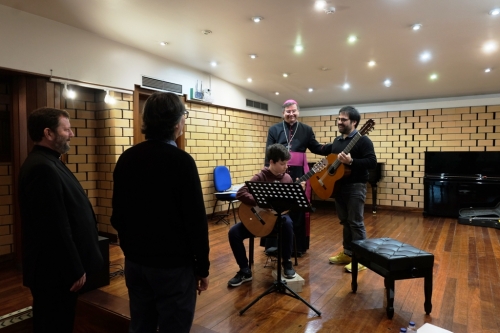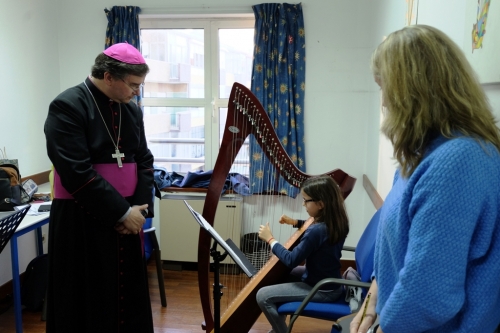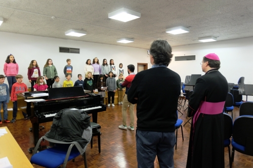 Harpa, violino, violoncelo, guitarra ou flauta. Estes foram alguns dos instrumentos que D. Américo Aguiar pôde escutar durante a visita à Escola de Música Nossa Senhora do Cabo de Linda-a-Velha. Na tarde do passado dia 14 de fevereiro, o Bispo Auxiliar de Lisboa esteve nesta instituição da paróquia, que tem mais de 40 anos e por onde já passaram mais de quatro mil alunos. “Quero ver os vossos nomes e as vossas caras nos cartazes dos grandes concertos por esse mundo fora”, brincava D. Américo, em cada uma das salas por onde ia passando. O Bispo Auxiliar de Lisboa cumprimentou os diversos professores e também cada aluno, perguntando-lhes que instrumento tocava, e partilhando igualmente que, no seu tempo de seminário, o instrumento que escolheu foi o piano. “Mas a minha vocação acabou por ser outra”, gracejava.