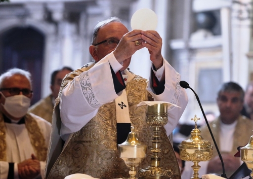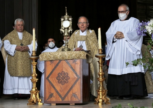 Na celebração do Corpo de Deus deste ano, devido à pandemia, não houve a tradicional procissão pelas ruas da cidade de Lisboa. “Hoje não poderemos sair em procissão. Mas o Corpo de Cristo continuará a oferecer-se, por nós que o comungamos e à cidade que edificamos, no cuidado comum. Connosco, forma um só corpo e connosco chegará aonde formos”, garantiu o Cardeal-Patriarca que, no final da celebração, benzeu a cidade e a diocese, no adro da Sé Patriarcal, com o Santíssimo Sacramento.
