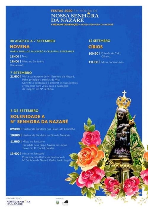 O Bispo Auxiliar de Lisboa D. Daniel Henriques vai presidir, a 8 de setembro, terça-feira, a partir das 11h00, à Missa nas Festas 2020 em honra de Nossa Senhora da Nazaré, numa celebração que vai ter lugar no santuário. As festividades iniciaram no dia 30 de agosto, com a novena diária no santuário (Terço, às 18h00, e Missa, às 19h00), que se prolonga até 7 de setembro, dia em que, às 21h00, haverá a visita da imagem de Nossa Senhora da Nazaré pelas principais artérias da vila. A população foi convidada a decorar as janelas e varandas.