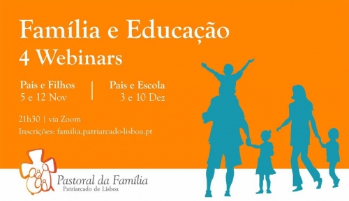 O ciclo de webinars sobre ‘Família e Educação’, do Setor da Pastoral da Família do Patriarcado de Lisboa, prosseguiu no dia 12 de novembro, e vai também decorrer a 3 e 10 de dezembro, sempre a partir das 21h30. Dirigida a pais, filhos e educadores, esta iniciativa é composta pelo Módulo 1, sobre ‘Pais e Filhos’, que decorreu nos dias 5 e 12 de novembro, com ‘Educar para quê?’ e ‘Serão os pais competentes para educar?’, e o Módulo 2, ‘Pais e Escola’, a 3 e 10 de dezembro, sobre ‘O valor dos adultos para as crianças e jovens’ e ‘Liberdade de Educação’. Em cada webinar, além da palestra haverá uma mesa redonda.