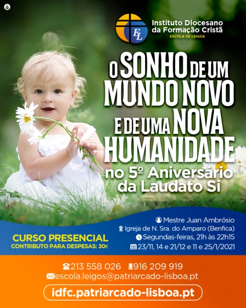 ‘O sonho de um mundo novo e de uma nova humanidade - Desafios e interpelações aos cristãos e às suas comunidades’ é o tema do curso presencial que o IDFC - Instituto Diocesano da Formação Crista, através da Escola de Leigos, vai promover na Paróquia de Nossa Senhora do Amparo de Benfica, no 5.º aniversário da encíclica Laudato Si’, do Papa Francisco. Com um contributo para despesas de 30 euros, esta formação vai ter como formador Juan Ambrósio e decorre em cinco sessões, às segundas-feiras, nos dias 23 de novembro, 14 e 21 de dezembro e 11 e 25 de janeiro de 2021, das 21h00 às 22h15.