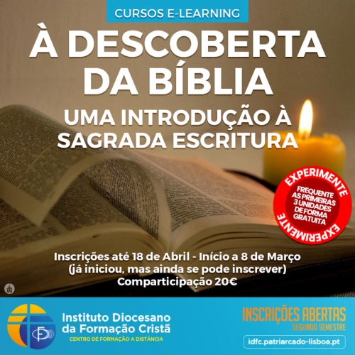 O Instituto Diocesano da Formação Cristã (IDFC) está a aceitar inscrições, até dia 18 de abril, para o curso em regime e-learning ‘À descoberta da Bíblia - Uma introdução à Sagrada Escritura’, que teve início a 18 de março. Esta formação visa “proporcionar uma formação elementar sobre a Sagrada Escritura”. “Nele poderá encontrar resposta a perguntas básicas como: quem escreveu a Bíblia? Por que razão este livro é tão importante para a humanidade? Quais os livros que a compõem e quando foram escritos?”, salienta um comunicado, referindo ser possível “experimentar as primeiras três Unidades” de forma gratuita.