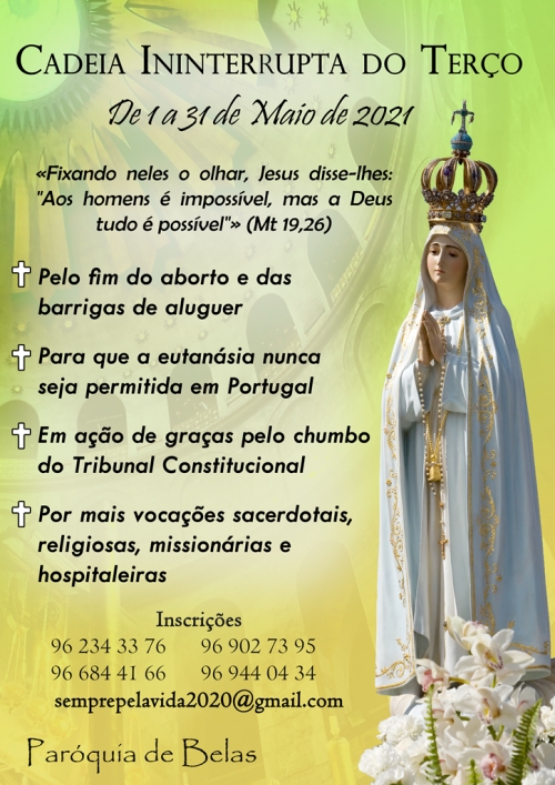 A paróquia de Belas iniciou, novamente, uma cadeia ininterrupta de oração do terço, que vai decorrer ao longo de todo este mês de maio, durante as 24 horas do dia. Tal como aconteceu no passado mês de fevereiro, esta paróquia da Vigararia da Amadora está agora a rezar em “ação de graças pelo chumbo à eutanásia pelo Tribunal Constitucional”, bem como “pelo fim do aborto e das barrigas de aluguer” e “por mais vocações sacerdotais, religiosas, missionárias e hospitaleiras”, segundo explica um comunicado.