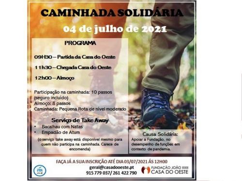 A Fundação João XXIII/Casa do Oeste está a promover uma caminhada solidária, no próximo Domingo, dia 4 de julho, às 9h30, a que se segue um almoço, igualmente de cariz solidário. Com início e final nas instalações desta associação, em Ribamar, a caminhada tem um tempo previsto de aproximadamente 2 horas, num percurso de nível moderado, e uma comparticipação de 10 euros (incluindo seguro do participante). A refeição tem um custo de 8 euros. “Ambas as iniciativas têm como finalidade apoiar a Fundação a dar continuidade às suas funções em tempos de pandemia”, refere a organização.