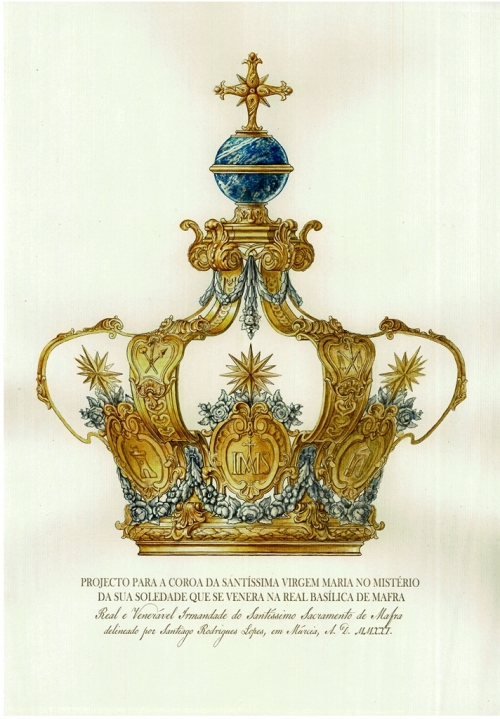 A Real e Venerável Irmandade do Santíssimo Sacramento de Mafra revelou o projeto da coroa que será realizada para a coroação canónica de carácter pontifício, com a qual o Papa Francisco distinguiu a imagem de Nossa Senhora da Soledade de Mafra. O projeto foi criado pelo artista Santiago Rodrigues Lopes, “que se inspirou nos modelos de coroas atribuídos a João Frederico Ludovice, arquiteto do Real Edifício de Mafra”, segundo um comunicado. “A coroa é rematada com um orbe em lápis-lazúli, e uma cruz que reproduz o modelo da coroa real portuguesa”.