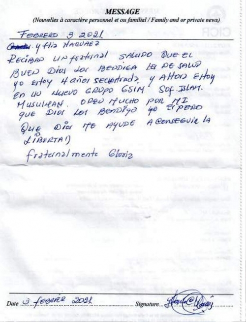 É um bilhete apenas. Escrito em castelhano, pelo próprio punho de Gloria Narváez Argoty, tinta azul de esferográfica, letra maiúscula, 11 linhas no total. Foi enviado através da Cruz Vermelha Internacional. Foi enviado para a família, em Pasto, uma cidade muito pequena onde nasceu a religiosa franciscana. No texto, a Irmã Gloria recorda que está em cativeiro há quatro anos. “As minhas saudações fraternais. Que o bom Deus voz abençoe e vos dê saúde. Estou raptada há quatro anos e agora estou num novo grupo.” Trata-se, tudo o indica, do “Grupo de Apoio ao Islão e aos Muçulmanos”, uma aliança jihadista do Sahel, vinculada à Al-Qaeda. No bilhete, a Irmã Glória pede as orações de todos para conseguir a tão desejada liberdade. “Rezem muito por mim. Que Deus vos abençoe. Espero que Deus me ajude a alcançar a liberdade. Fraternalmente, Glória.”