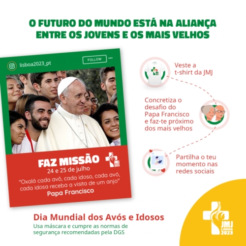 A organização da Jornada Mundial da Juventude (JMJ) Lisboa 2023 convidou “cada jovem” a “fazer missão onde quer que esteja”, por ocasião do I Dia Mundial dos Avós e dos Idosos, convocado pelo Papa Francisco. Este “grande movimento nacional” pretende “juntar os jovens aos mais idosos”, no fim-de-semana de 24 e 25 de julho. “O convite é, onde quer que estejamos, olhar e cuidar dos avós e dos mais velhos, seguindo precisamente o apelo do Papa Francisco do encontro de gerações”, desafia o COL (Comité Organizador Local) da JMJ Lisboa 2023.