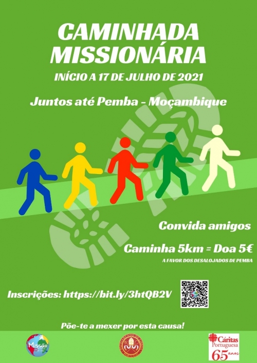 Percorrer, de forma simbólica, os 10.302 km que separam Lisboa de Pemba, em Moçambique. É este o desafio do Sector de Animação Missionária do Patriarcado de Lisboa com a Caminhada Missionária, com o lema ‘Juntos até Pemba, Moçambique!’, que teve início a 17 de julho e termina dia 31 de outubro. O desafio passa por correr ou andar 5 km, doar 5 euros à Cáritas Portuguesa para enviar para Pemba (para o recibo de donativo, contactar recibos@caritas.pt) e desafiar 5 amigos nas redes sociais para fazerem o mesmo, utilizando o hastag #JuntosAtéPemba. “Convida os teus amigos e põe-te a mexer por esta causa!”, convida este secretariado diocesano.