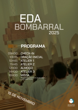 Organizada pelo Serviço Diocesano de Acólitos (SDA) do Patriarcado de Lisboa, esta atividade diocesana vai ter como ponto de encontro a Escola Básica e Secundária Fernão do Pó, no Bombarral, às 9h30. Pelas 10h15, tem lugar a oração inicial, a que se seguem os Ateliers 1 e 2 e o almoço, às 12h30. Após a refeição, o Atelier 3 inicia às 14h00. O Encontro Diocesano de Acólitos 2025 termina com a Missa presidida pelo Bispo Auxiliar de Lisboa D. Alexandre Palma, às 16h00. Existem duas modalidades de inscrição: sem almoço incluído, por 5¤, ou com almoço incluído, por 8¤. As inscrições estão abertas até à semana anterior ao EDA, no caso o dia 8 de novembro.![]() |