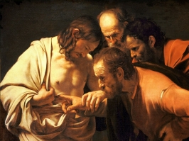 O segundo episódio, também está representado pelo pintor Caravaggio numa das suas indiscutíveis obras-primas. Tomé não está com os discípulos quando Jesus os visita inesperadamente para demonstrar a Ressurreição. Quando lhe contam o sucedido, ele não acredita, e diz que precisa de ver para crer. O relato é-nos feito por João. Uma semana depois, Cristo regressa e Tomé já está. Lembremo-nos da imagem dada pelo genial pintor na referida pintura. Tomé, o pescador, olha fixamente para o lado trespassado pela lança do soldado quando Cristo estava na cruz. É impressionante o realismo com que a mão e o dedo se aproximam da abertura exposta. Percebemos não ser necessário o contacto, basta o pedido. “Meu Senhor e meu Deus!”. De novo, como no caso de Pedro, somos nós que ali estamos representados. Nós duvidámos e temos necessidade de que a prova seja dada. E o quadro é um autêntico espelho de quem verdadeiramente somos. E do que se trata, de facto, é de reconhecermos que sendo naturalmente imperfeitos, somos pessoas de pouca fé…