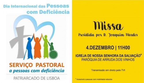 O Serviço Pastoral a Pessoas com Deficiência do Patriarcado de Lisboa está a promover a celebração do Dia Internacional das Pessoas com Deficiência, a 4 de dezembro, Domingo, com uma Missa na paróquia de Arruda dos Vinhos. A celebração vai ser presidida por D. Joaquim Mendes, Bispo Auxiliar de Lisboa, na Igreja de Nossa Senhora da Salvação, que é acessível a pessoas com mobilidade reduzida, e tem transmissão em direto através da TVI, às 11h00.