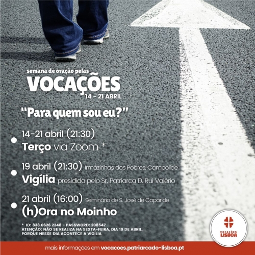 A Semana de Oração pelas Vocações 2024 tem como lema ‘Para quem sou eu?’, sugerido a partir do n.º 286 da Exortação Apostólica do Papa Francisco aos jovens ‘Cristo vive’. No Patriarcado de Lisboa, além da Semana.com, há ainda diversas iniciativas que podem ser consultadas neste link.