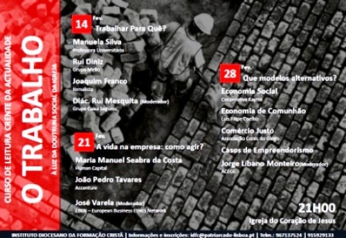 A segunda edição do Curso ‘Leitura Crente da Actualidade à Luz da Palavra de Deus’, proposto pelo Instituto Diocesano da Formação Cristã, do Patriarcado de Lisboa, tem reflectido sobre ‘O Trabalho. À luz da Doutrina Social da Igreja’. Após os dois primeiros módulos – ‘Trabalhar Para Quê?’ e ‘A vida na empresa: como agir?’ – a formação prossegue esta segunda-feira, dia 28 de Fevereiro, com o módulo de encerramento sobre ‘Que modelos alternativos?’. Será na Igreja do Sagrado Coração de Jesus, em Lisboa, em horário pós-laboral (das 21h às 22h30).